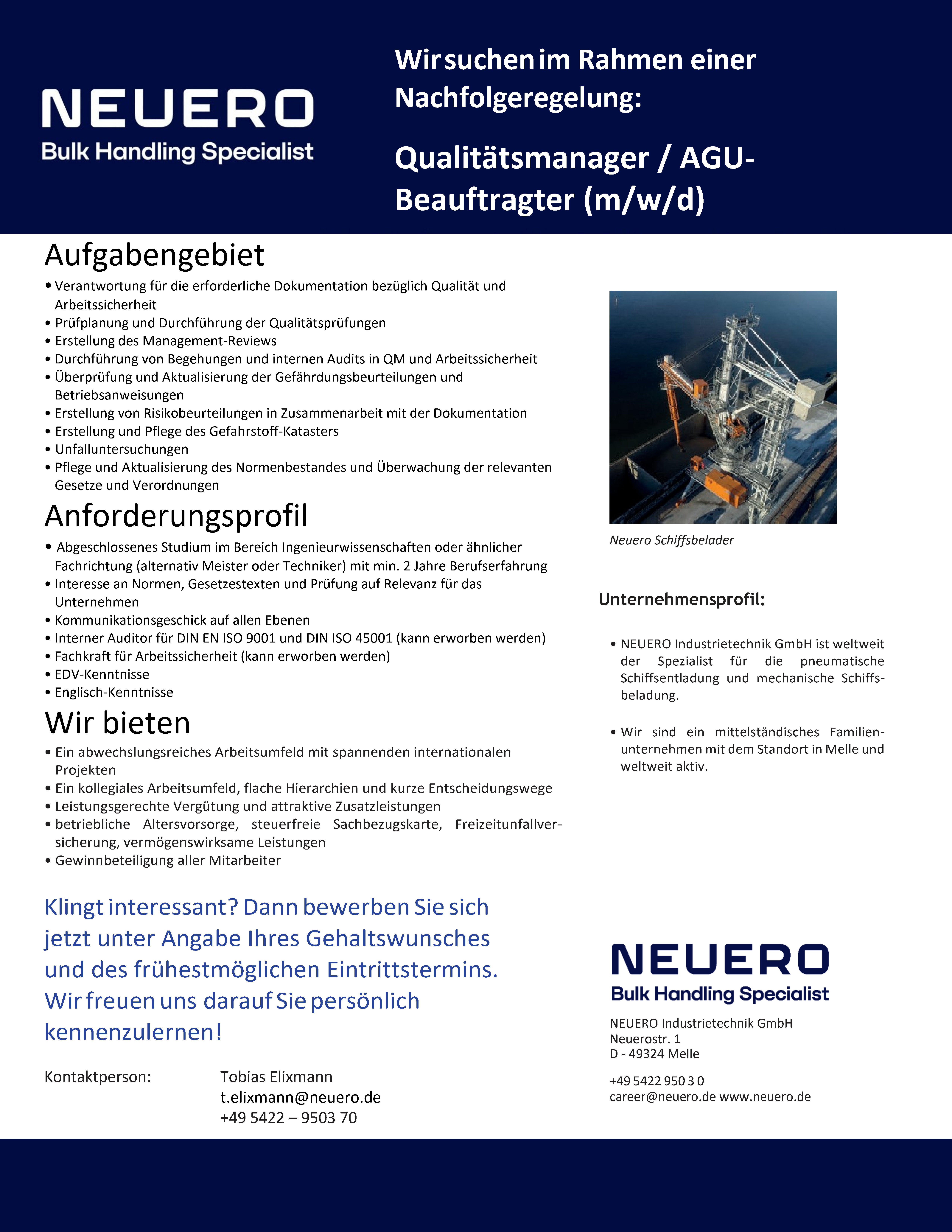 - Verantwortung für die erforderliche Dokumentation bezüglich Qualität und Arbeitssicherheit